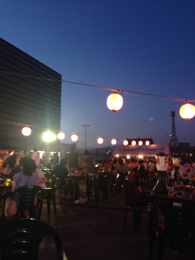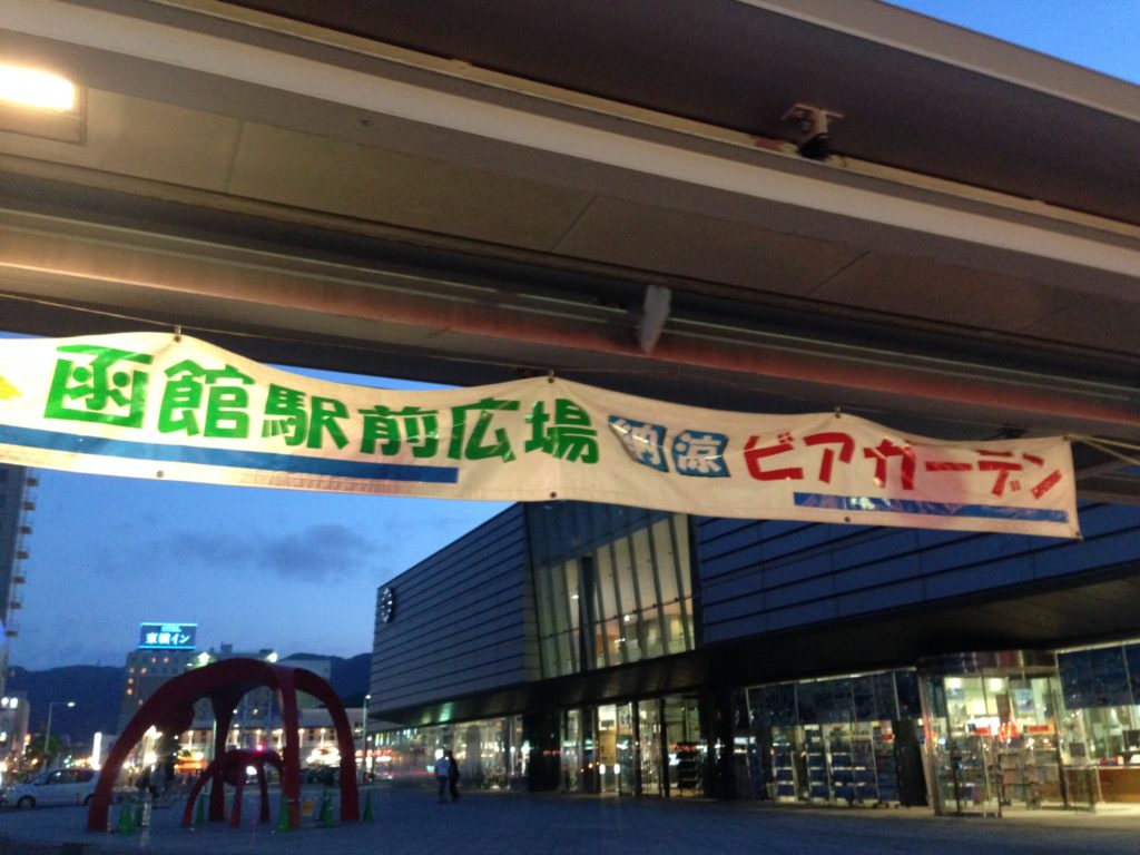 函館に戻り、晩ごはんは函館駅前広場のビアガーデンでジンギスカン!