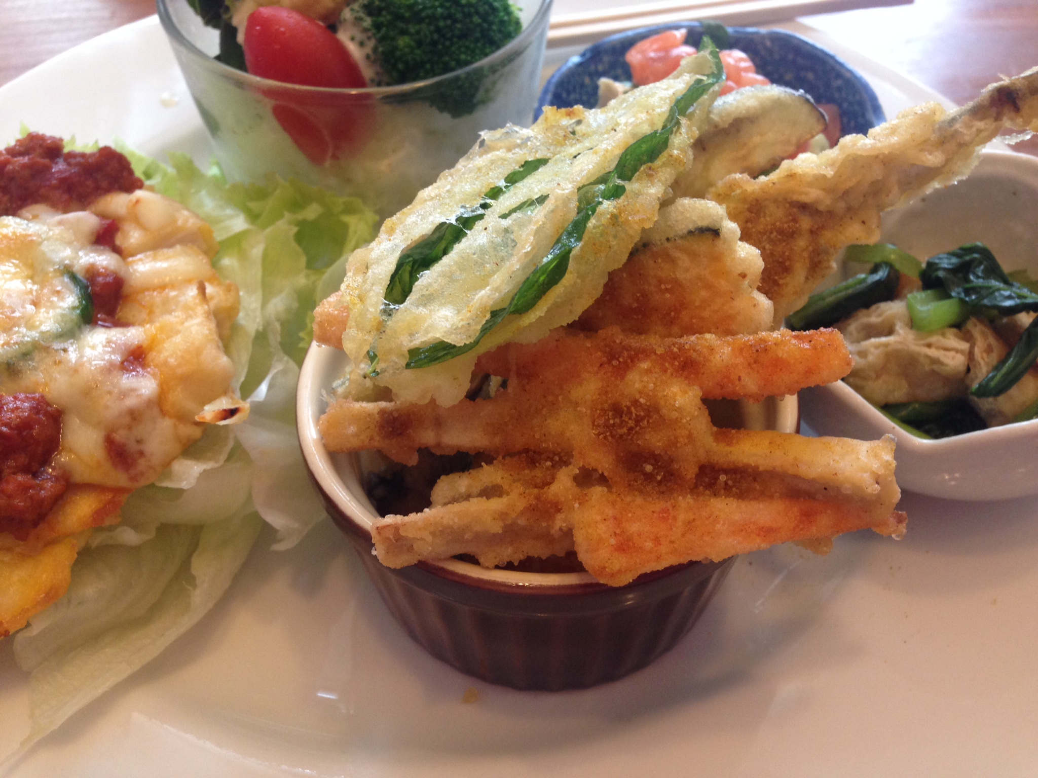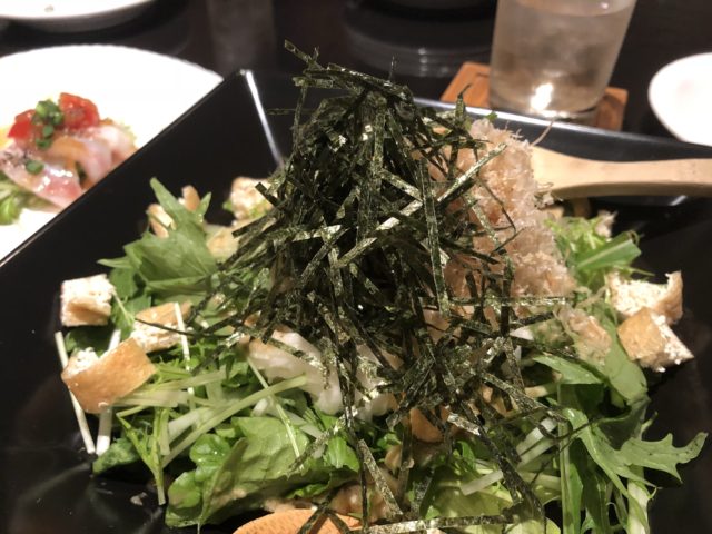 お揚げが入った和風なサラダ。そっか、こんなに風に油揚げをサラダに入れるのもいいな。やっぱり海苔と鰹節が合います。