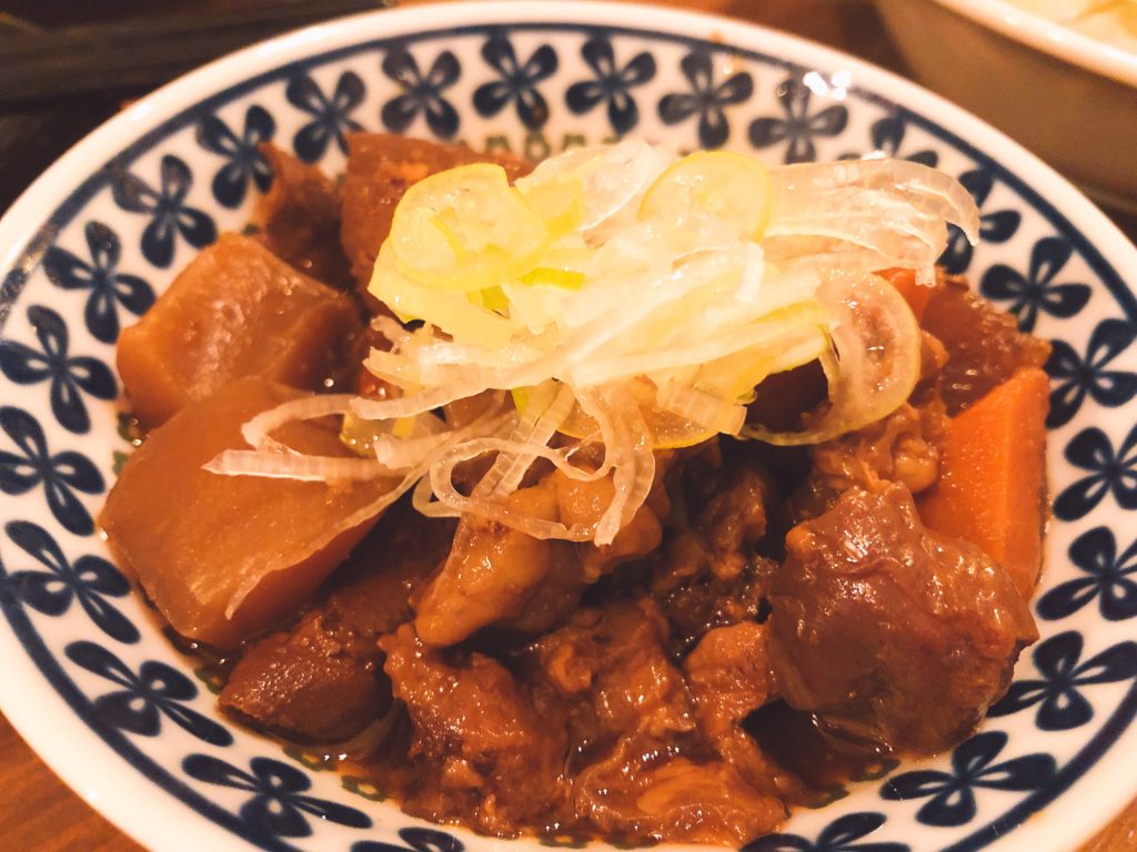 このモツ煮の味、好きかも。コンニャクのシミ加減もいい感じ。