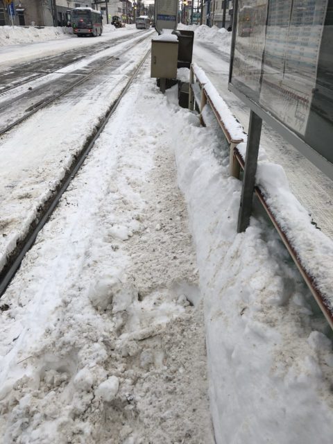 斜め向かいの家の方は夫婦揃っていつも雪掻きしているのでそこを通らしていただき、通りに出ると足跡がなく、そこから電停までの歩道、誰も歩いていない歩道。ひざ下くらい積もった雪の道を横断歩道まで歩く。それも大変なんだけど、横断歩道から電停までにたどり着くまで大変でした。車道や電車道路を除雪した後、歩く人のことなんて考えてないんだろうな〜。歩道から電停の安全地帯にたどり着くまで、車道に出るには横断歩道前に積まれた除雪後の雪山を跨いでいかなければいけないのだ。たどり着いた電停も大変な状態。時刻見るふりして足跡残してみた。