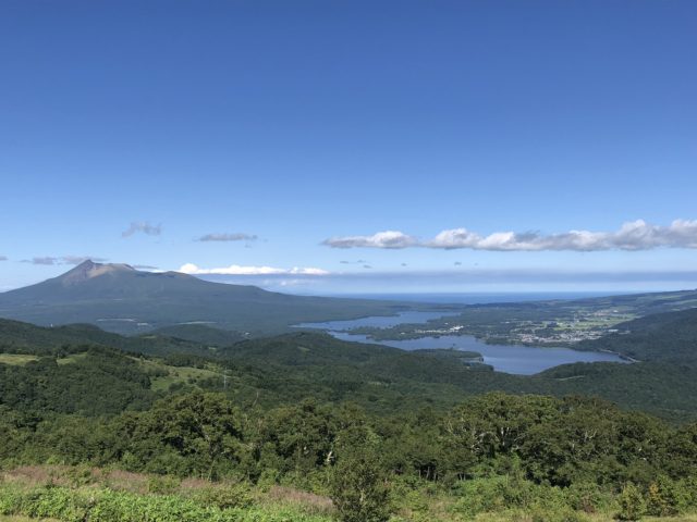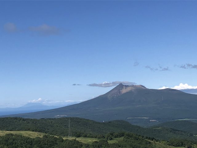駒ケ岳の奥に羊蹄山がかすかに見えます。雲がかかっているのが残念。