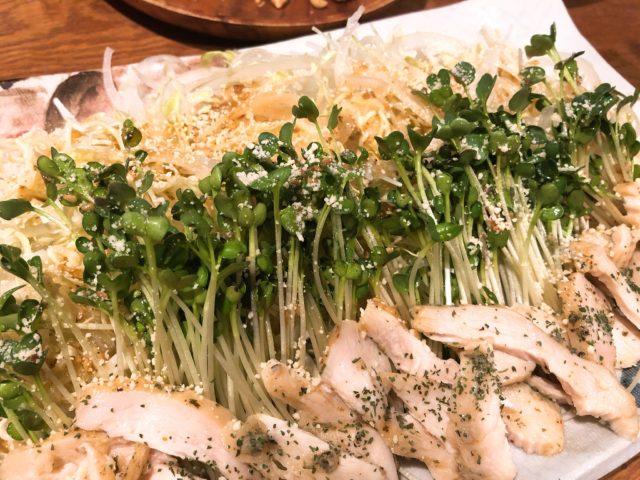 サラダはチキン、カイワレ、キャベツにタマネギ。いつもお野菜たっぷりだから有難い。Kenちゃんに作ってもらう前提で、大きなスライサーを以前提供…おかげでタマネギやキャベツがたっぷり食べられます。