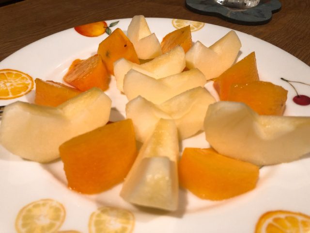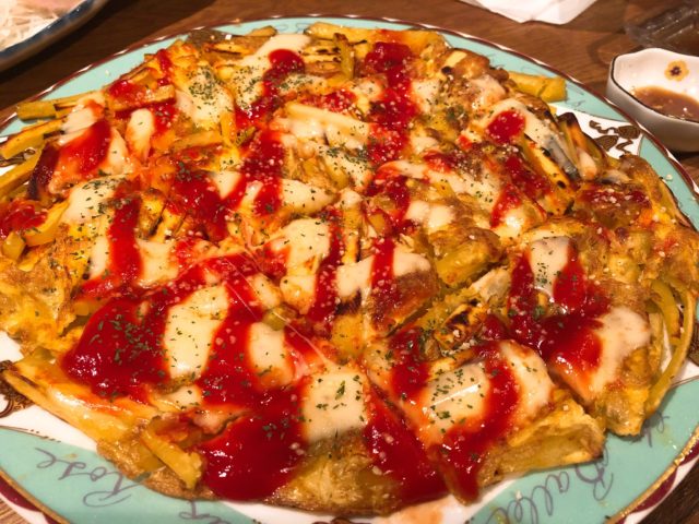 見た目ピザぽいですが、ベースはサツマイモです。……だからね、ちょっとスイーツみたいな感じです。でもトッピングは塩分ありで玉子とチーズで焼き上げてます。こういうのがあるので楽しみなんですよね、何が出でくるか…オリジナルメニューが楽しみです。