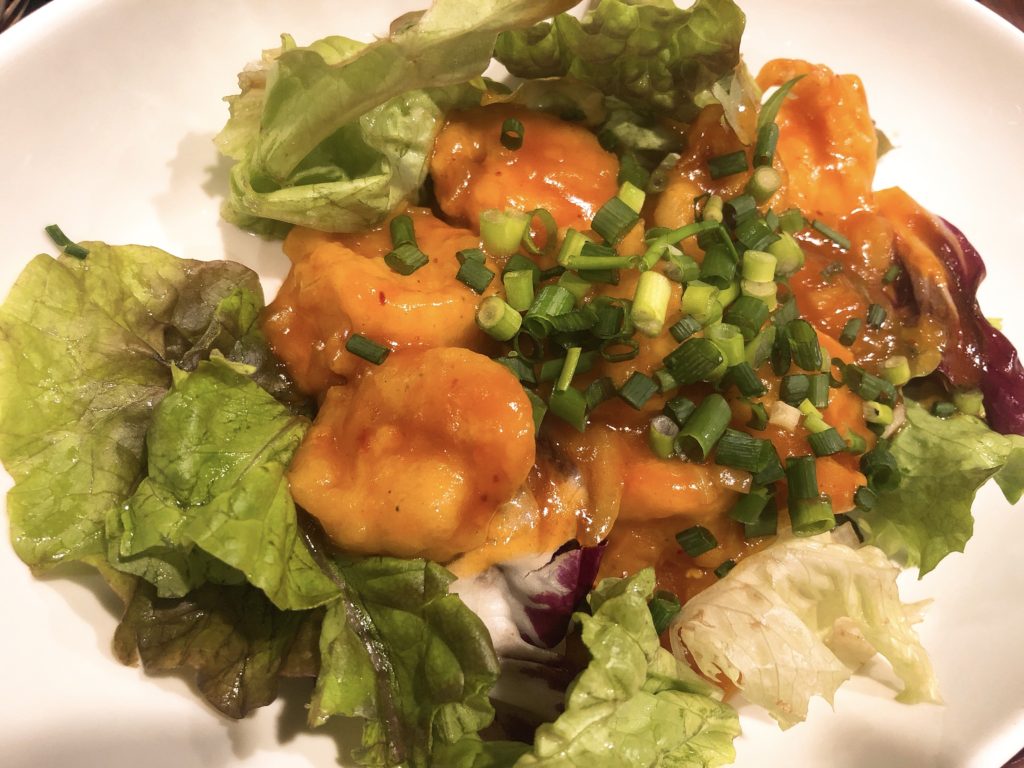 サラダって単独で出なかったな。生野菜に海老チリ。中華が出てきました。甘みと辛味がちょうどいい。
