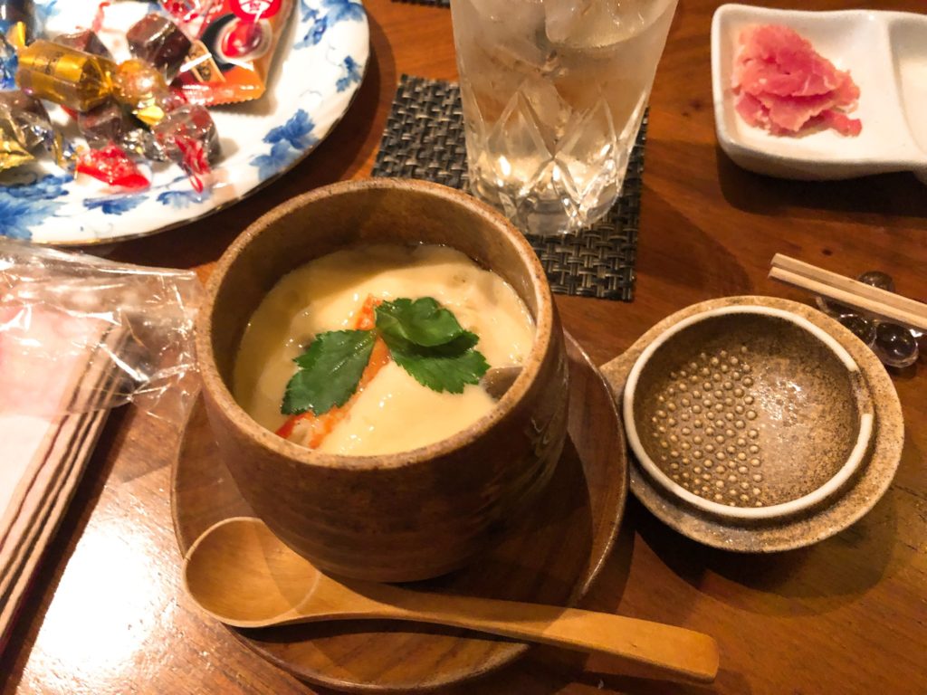 下のお店(居酒屋 魚丸)から出前を取ることになりました。とても美味しいという「茶碗蒸し」と、串焼きを。茶碗蒸しは具が多くて本当に美味しい。魚介からもいい出汁が出ているんでしょうね。