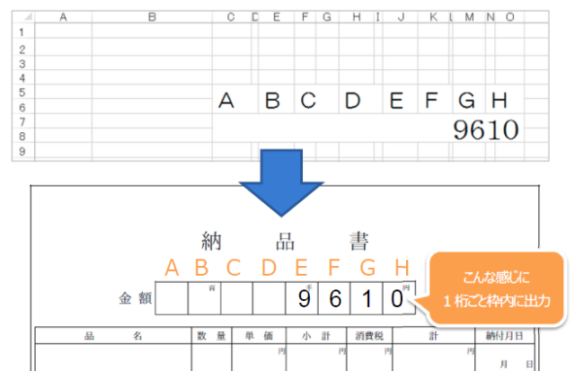 - A・B・C・・・ の枠に合計金額を入れたい(枠下が表示欄)