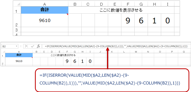 お客様優先なので頑張るか。集計したセルに入っている数値を各桁毎に別のセルに分割したいそうだ。