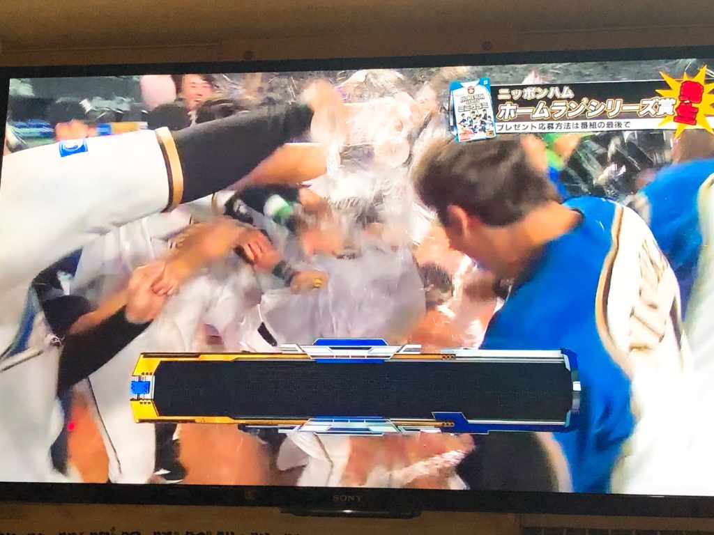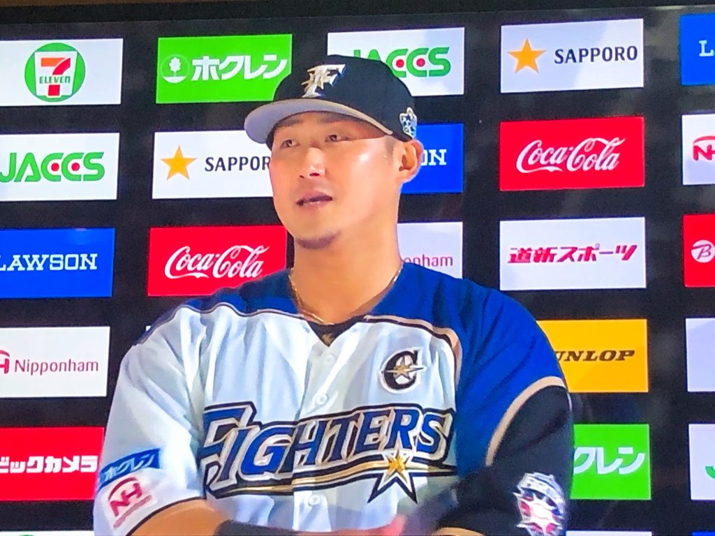 ヒーローインタビューのステージが新しくなったようだ。LEDのせいか、中田翔の顔が綺麗に見える。