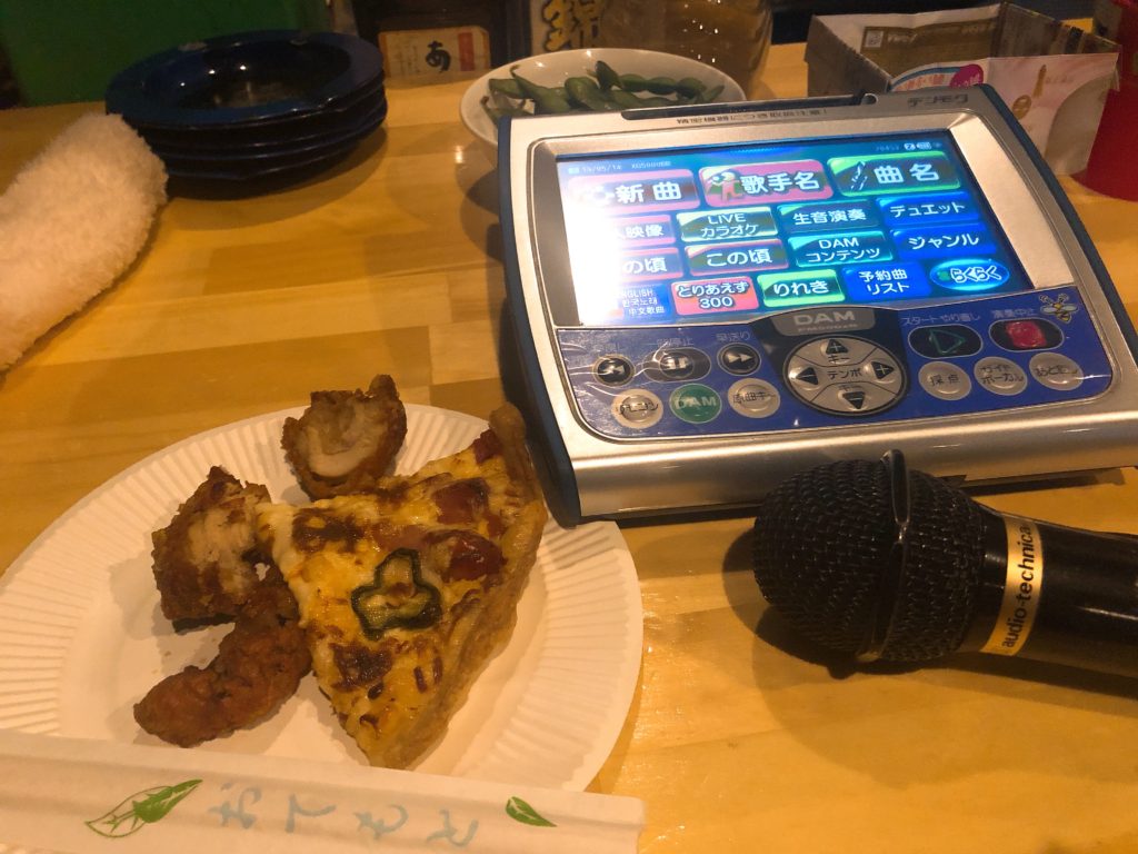 扉を開けたら、久し振りに常連さんに会えた。嬉しい。席に着いたらカラオケセット持ってきてくれました。いつもながらありがたいです。それとピザと唐揚げいただきました。