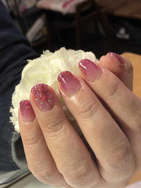 今日は少し濃い色です。薬指には透明のお花が盛られています。
