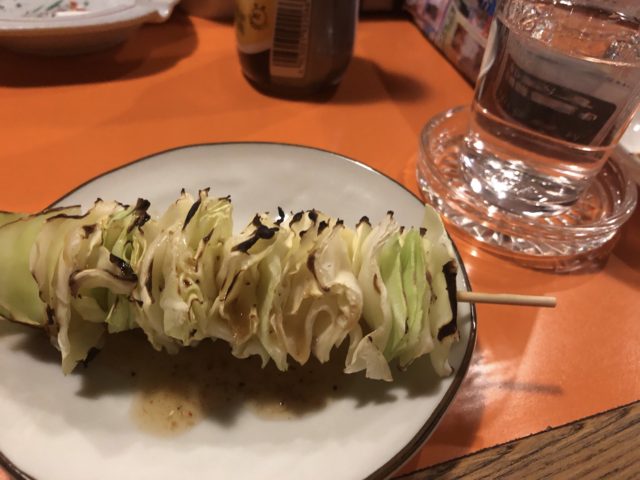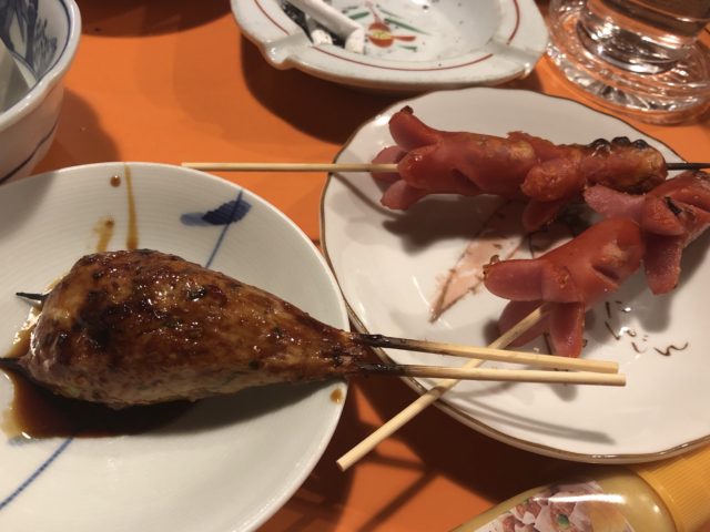 追加で、キャベツはちょっとさっぱりのタレでいただき、赤ウィンナー、そしてつくねはタレ、とり皮はカリッと。