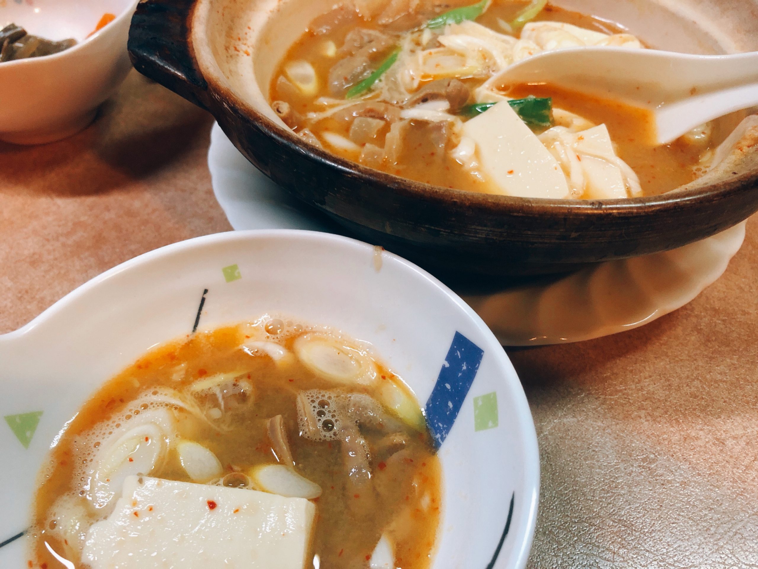 まずビールとホルモンの煮込みを注文。お腹空いていたのでホルモン煮込みはすぐ食べる事が出来るかと思って。煮込んであるものを普通に器でくるものだと思いましたが、ネギやお豆腐を取り出し切り出しました。ビール半分位飲んだ頃、ママさんが一人用のお鍋と器を運んできました。蓋付きのお鍋で出てきました。ママさんが蓋を開けてくれて湯気がふわ〜っと上がり熱々の煮込みが…。煮込みというよりもう一人鍋です。ホルモンたっぷり豆腐もたっぷりスープも。美味しくてペロリと食べてしまいました。寒くなってきて器で出したら味気ないからとママさんの気遣いでお鍋だったみたい。ありがたい事です。
