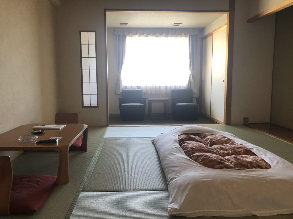 昼ゴハンを食べた後、部屋飲みするお酒を買い込んで、湯の川観光ホテルへ。既にお布団が敷いておりました。私の部屋はひとり部屋でこんな感じ。広々です。