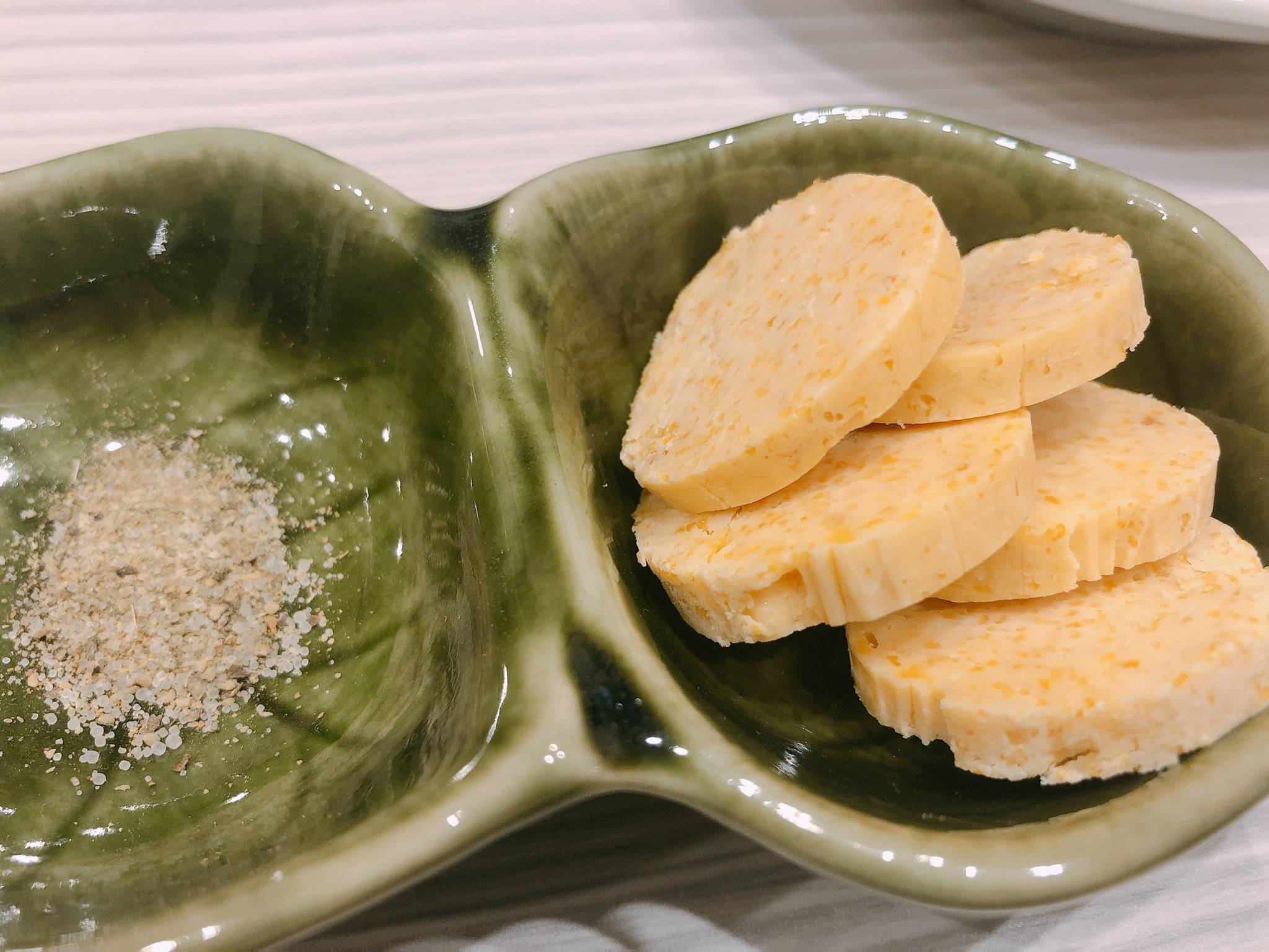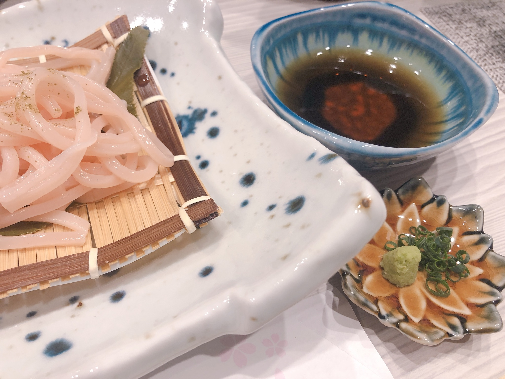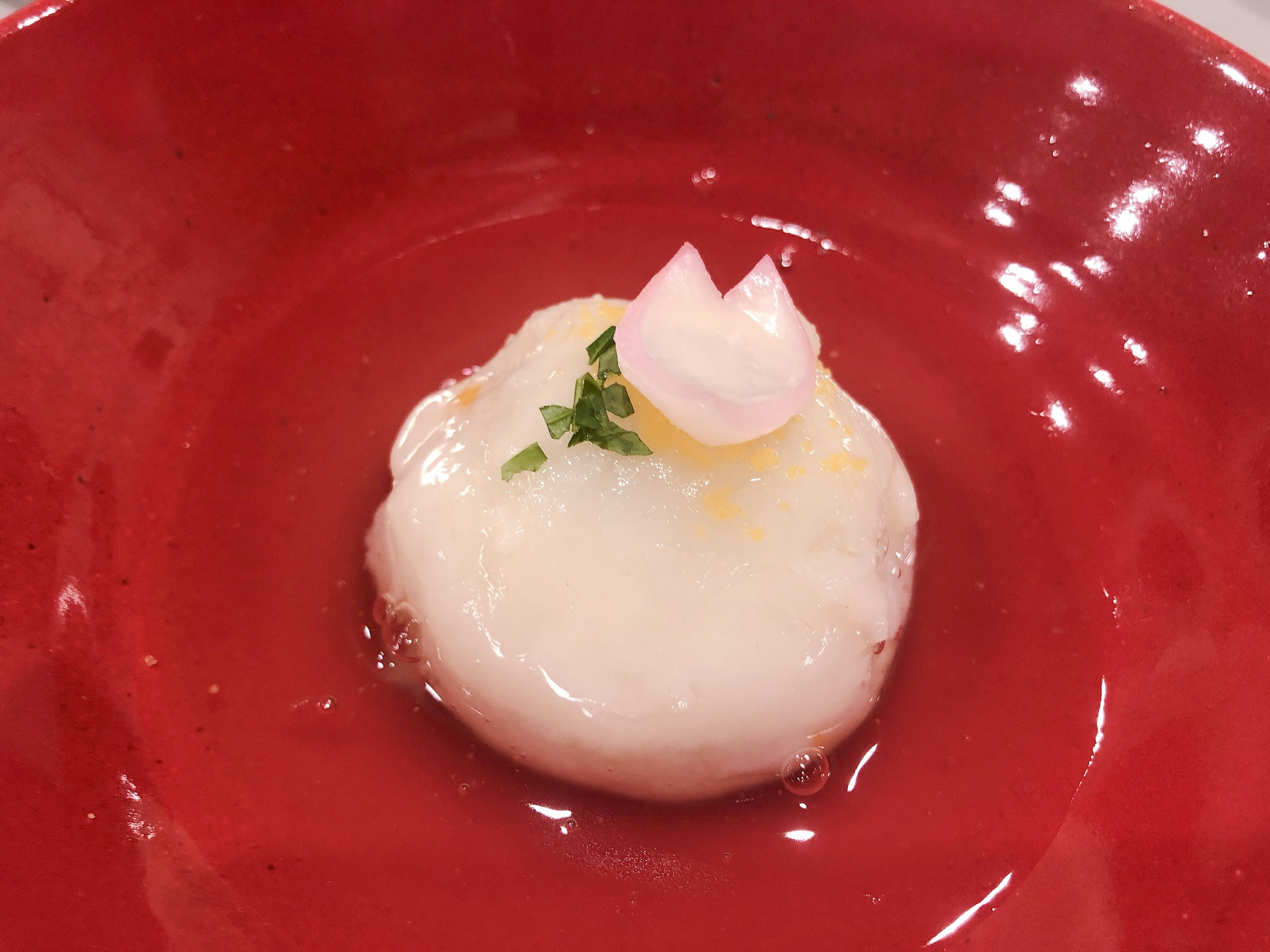 うにとゆり根饅頭がテーブルに。中にウニが入ったゆり根のお饅頭。餡掛けがお上品なお味。シメは桜うどんです。これもお上品なお味で美味しくいただきました。