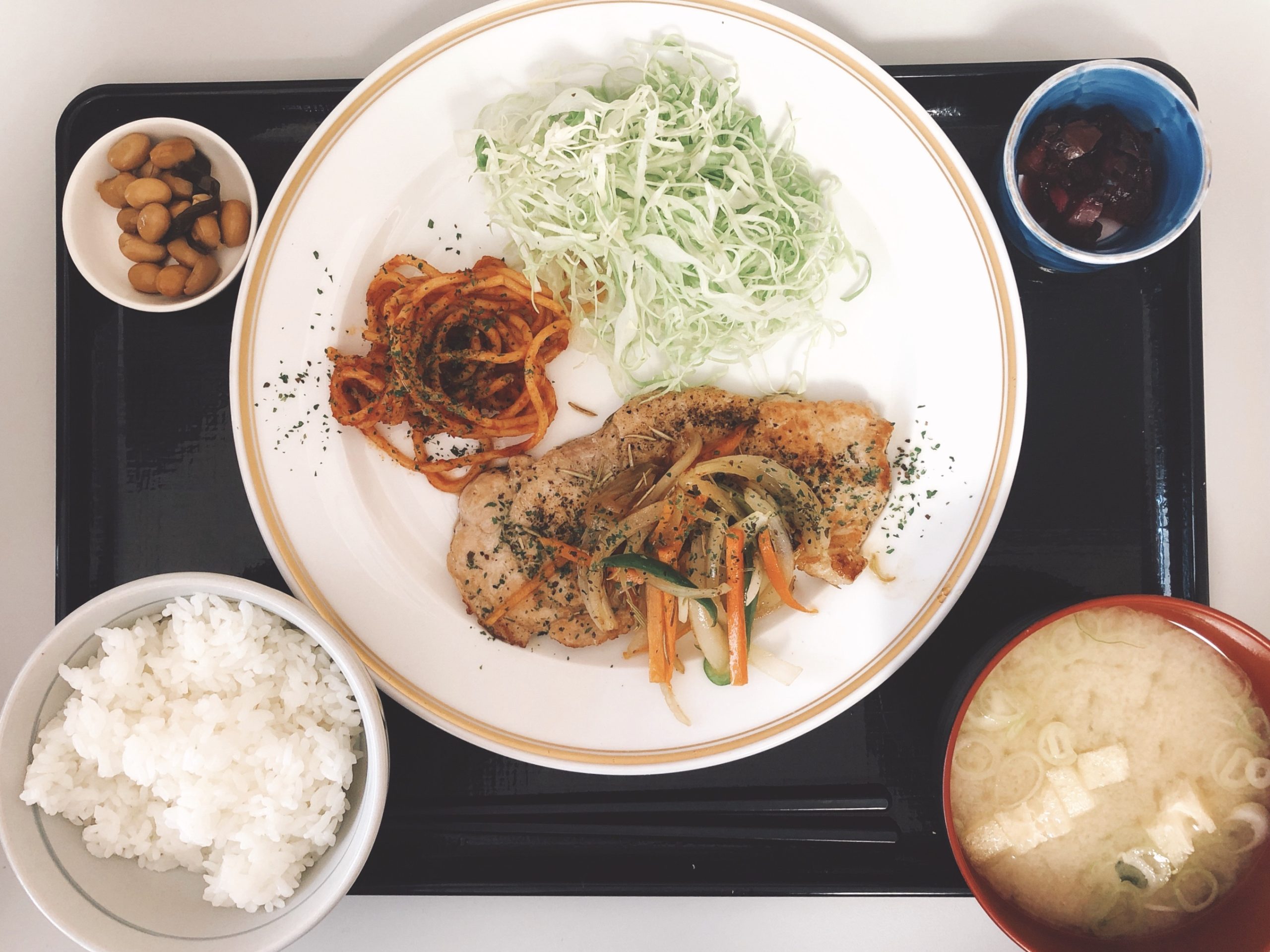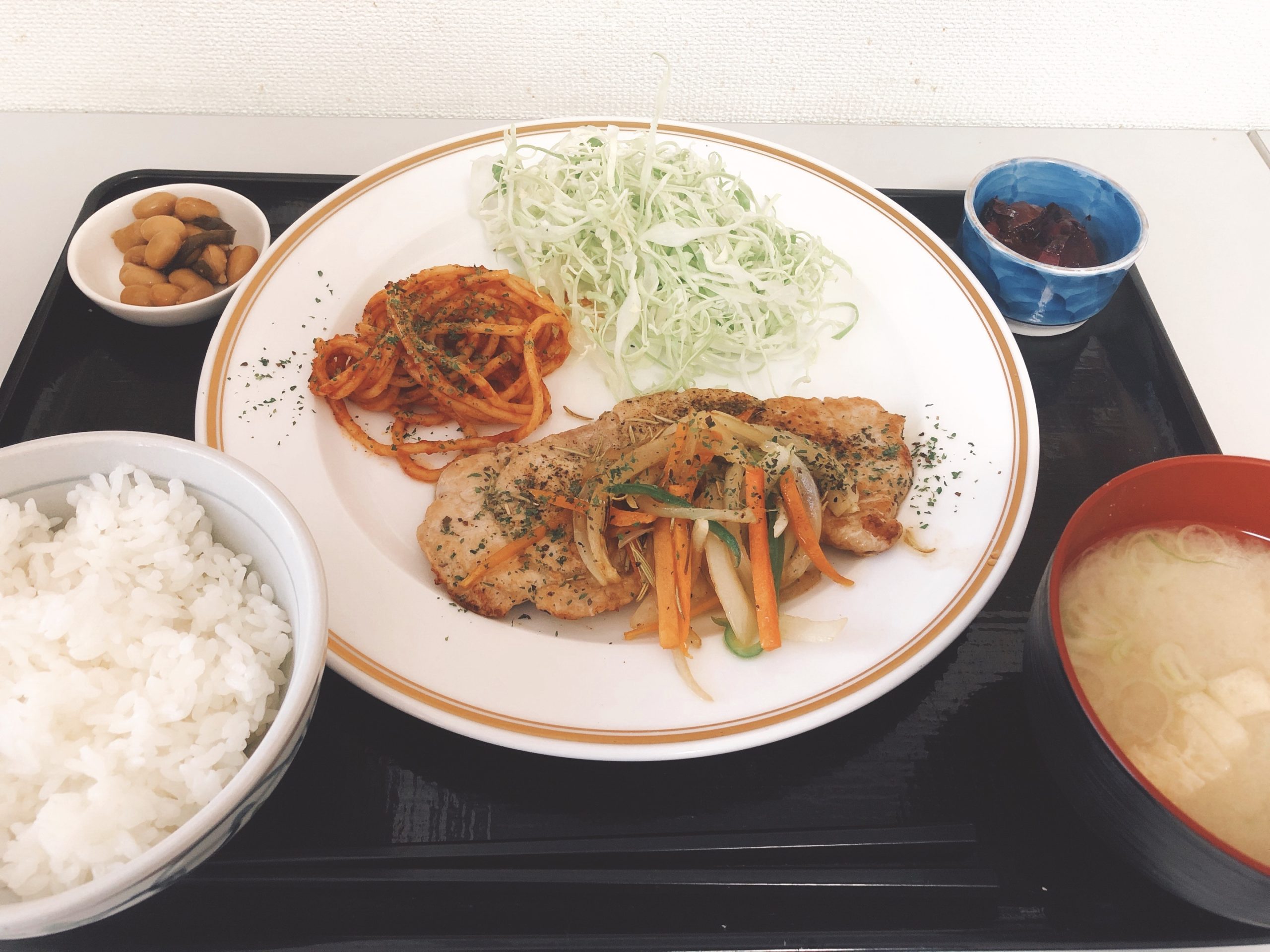 ご飯とお味噌汁のセルフサービス変わらずでしたので、ポークソテーがきてからご飯とお味噌汁を。小鉢は2つ付きました。大豆煮美味しかった。