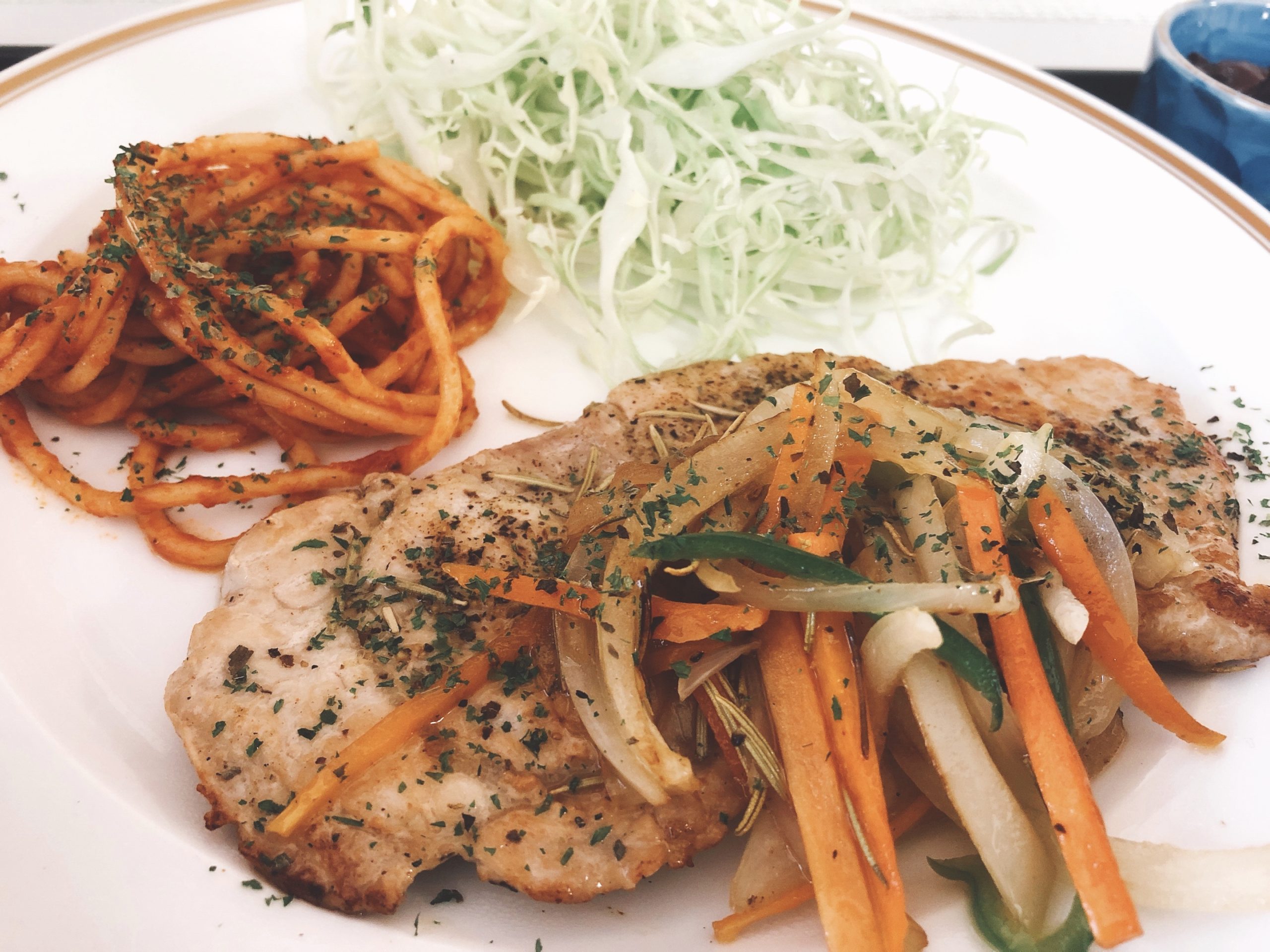 ポークソテーはハーブ(たぶんローズマリー)と胡椒のバランスも良く、お肉の柔らかさもよくて美味しかった。ナポリタンも相変わらず好きな味で美味しい。ポークソテーにハーブっていいですね。家だったら塩胡椒だけだもんね。カレー用のスパイスはあるけど今度はローズマリーとか買ってみようかな。