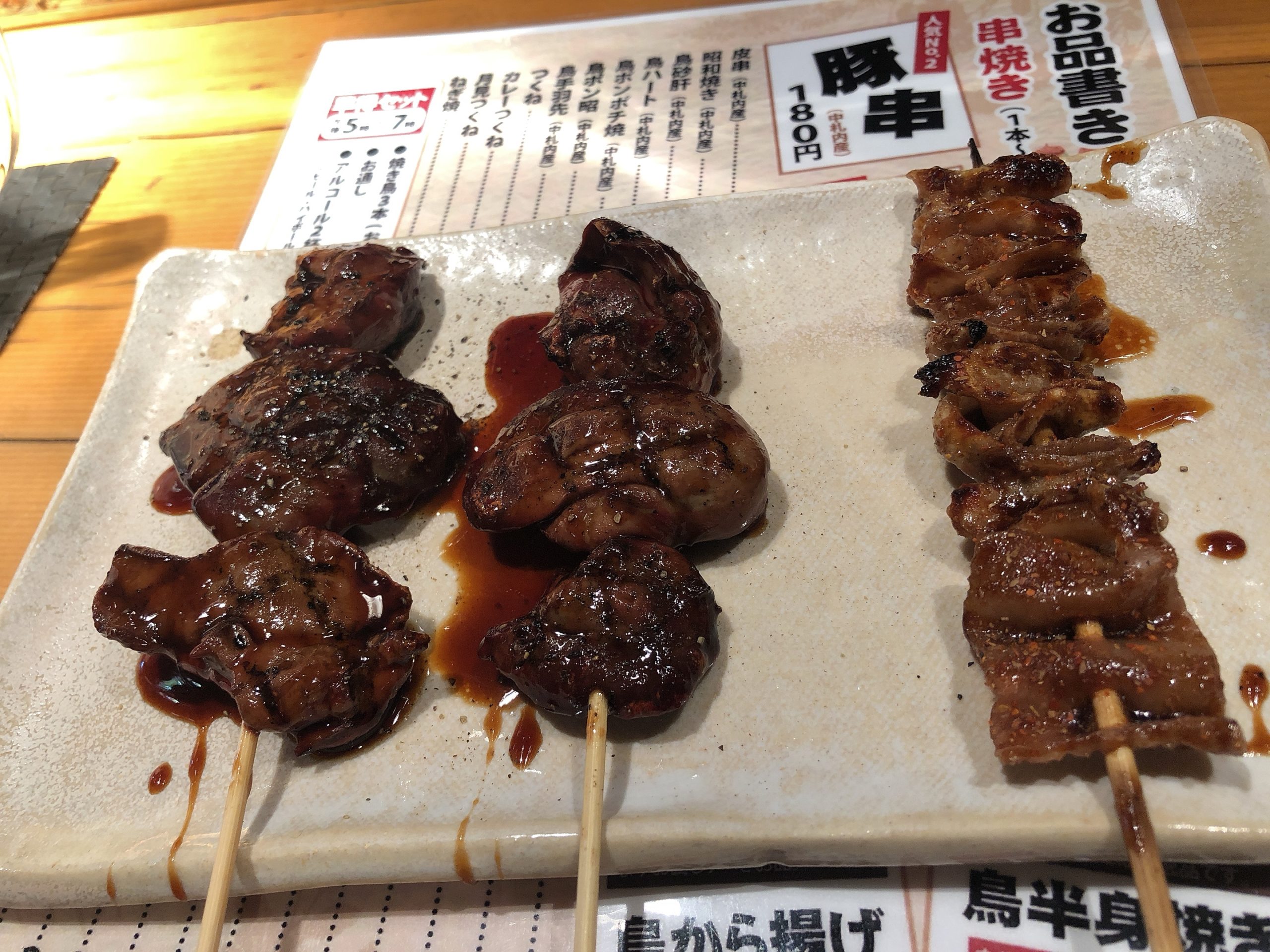 昭和焼きは甘辛のタレ味のカリカリの鳥皮は美味しいし豚串は脂が美味しい。
