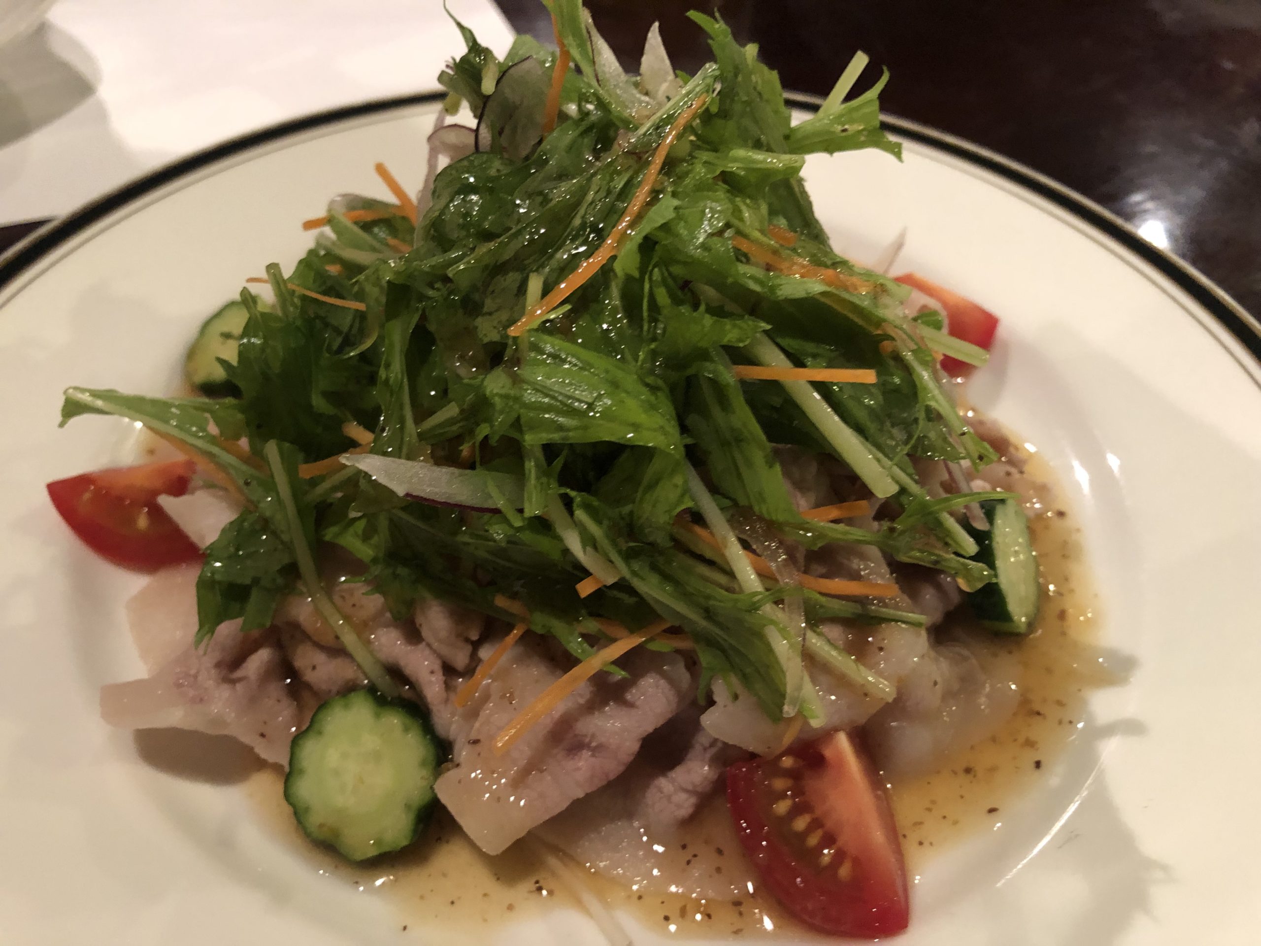 次はキレイに盛り付けられた「豚しゃぶサラダは柚子胡椒ソース」です。ちょうどいい豚肉とお野菜、それに柚子胡椒ソースが良くてとても食べやすいお味。