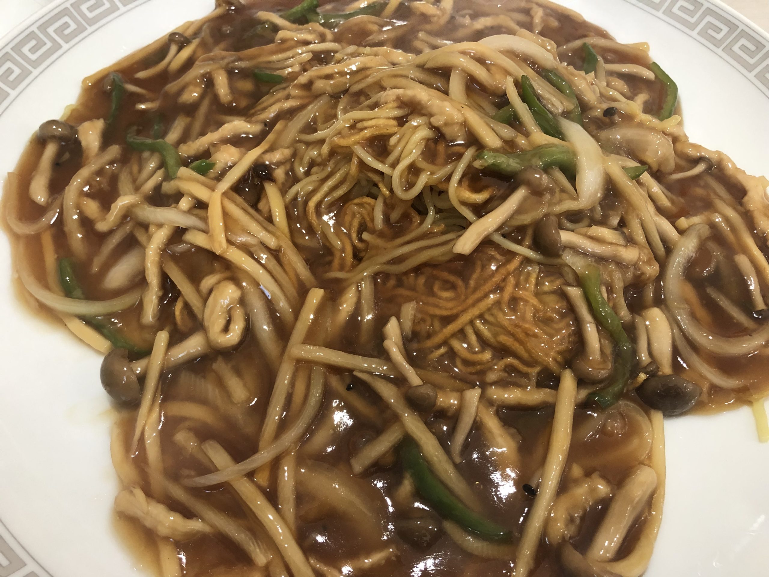 あんかけ焼きそばきました。お皿がデカイ! 30センチ以上はありそうだ。