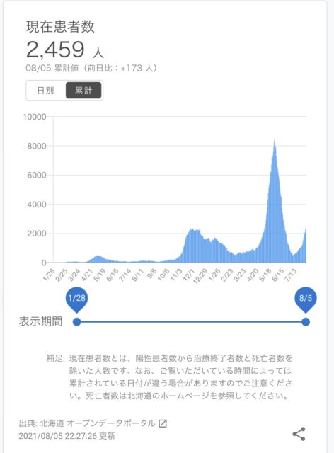 日本全体も北海道全体の新型コロナウィルス感染者がどんどん増えてます。デルタ株の出現でさらに感染者が増えてます。東京は5000人超え、大阪は1000人超え、沖縄は北海道の倍くらいの感染者が…。