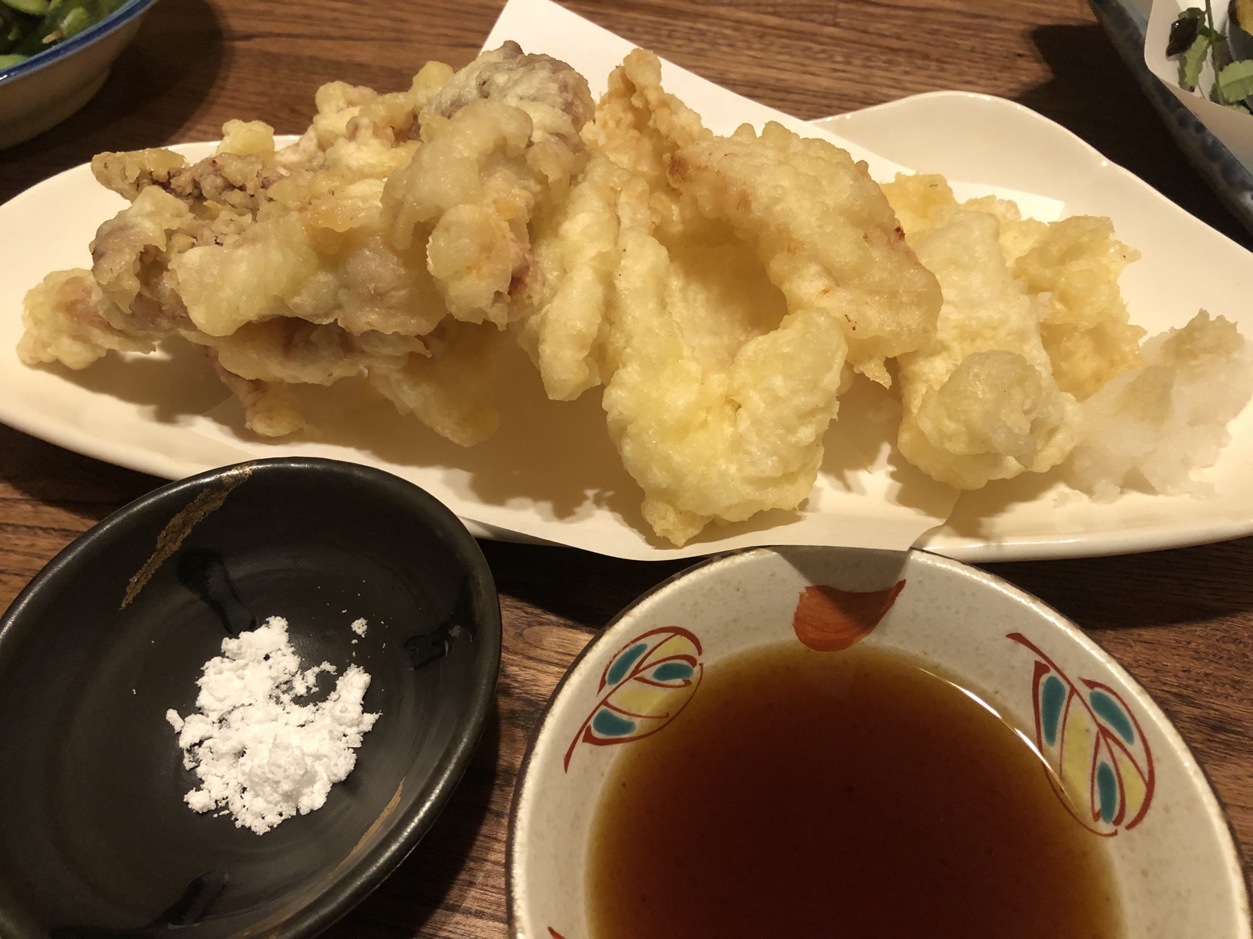 枝豆はゆでたてで湯気が出ている状態。これが私好みの固め。いか天はゲソもエンペラーも天ぷらにされていました。ちょっと小さめのイカを1杯天ぷらにしたんだろうって量でした。