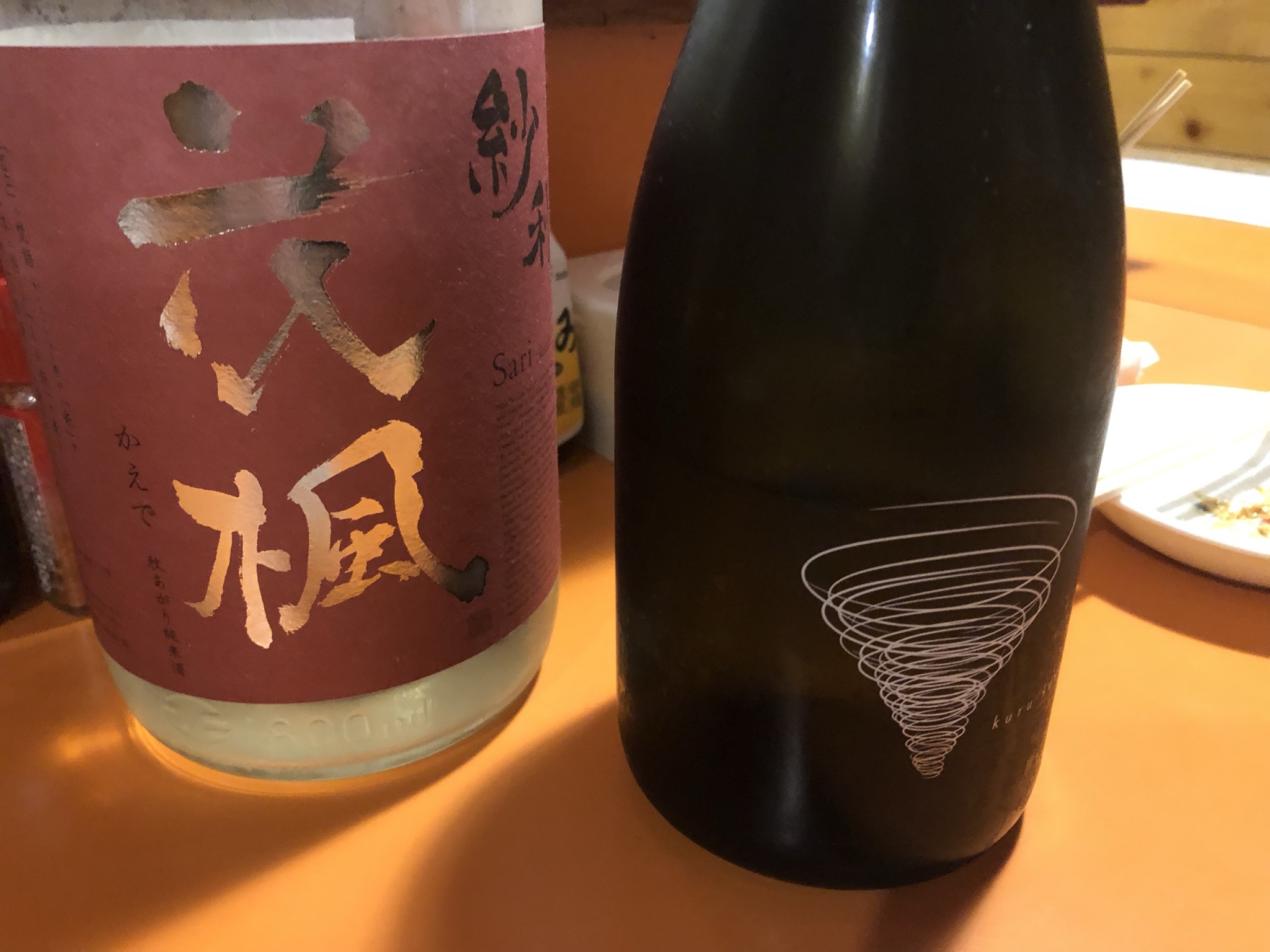 飲み物を日本酒に。「花楓」も「くるくる」も美味しい。「くるくる」のボトルが可愛いです。