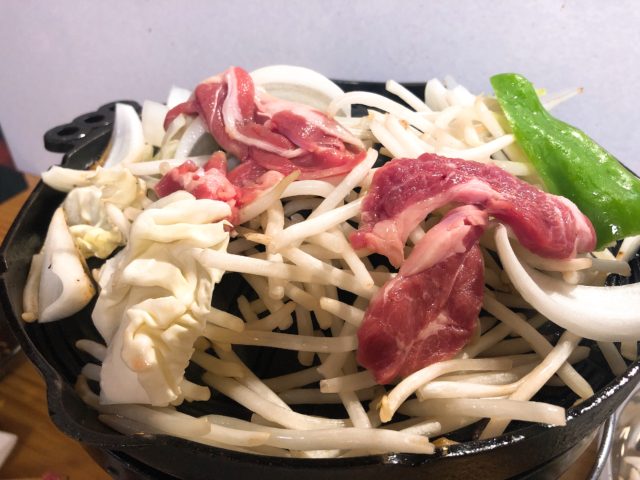 私にっとってはジンギスカンは焼肉じゃないの。お野菜と美味しく食べなきゃダメなの。厚切りのラムは別だけど、丸ラムはお野菜の上に。