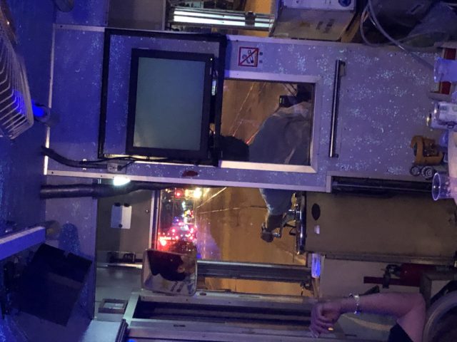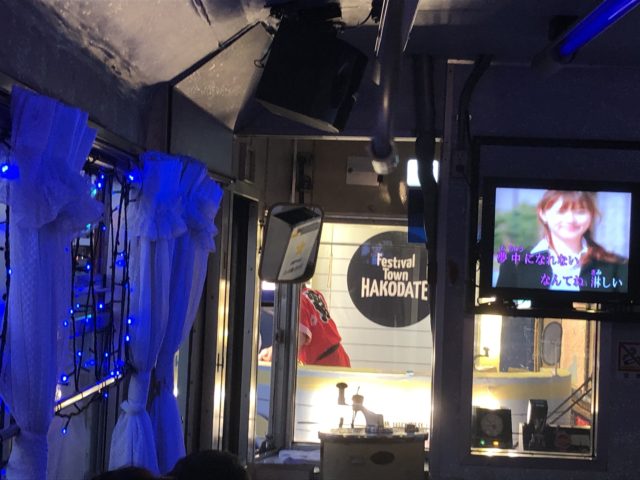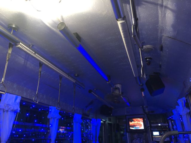 いいあんばいに暗くなってきたので、車内のライトがつきました。カラオケ電車もいい感じ。
