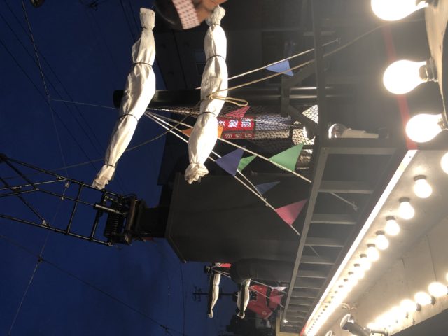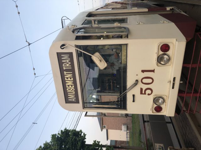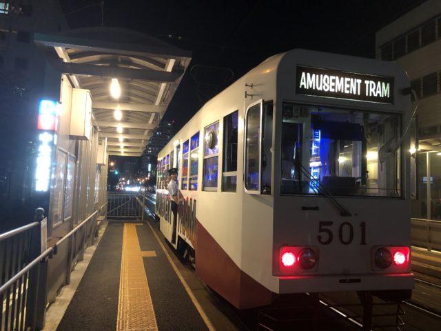 車内はいいあんばいにライトアップしてますが、来週は港まつりなので花電車がすぐ後ろからきていました。こっちも良いですね。花電車が出発した後、カラオケ電車も出発。