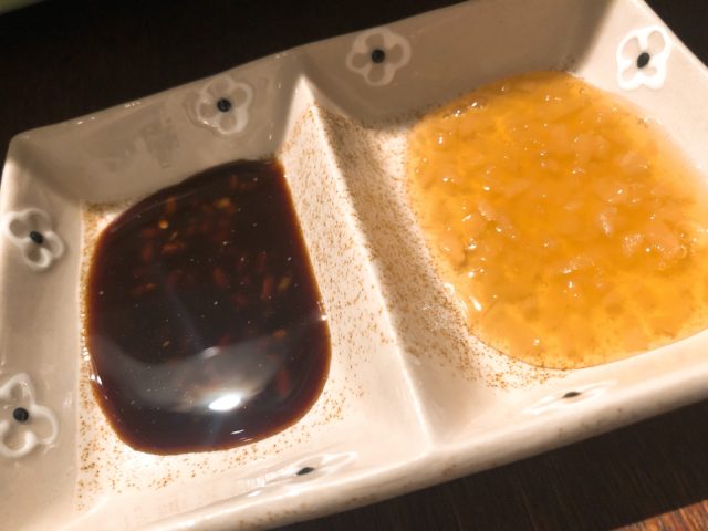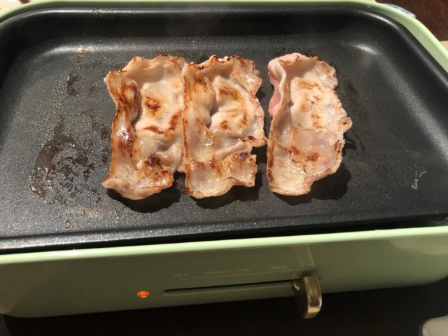 ホットプレート登場!まずは蒸しラム肉も野菜と餃子です。黒酢でも玉ねぎポン酢もどちらも野菜が甘くて美味しい。ラム肉も。餃子は水餃子より食べやすく、黒酢がぴったりでした。その後は、プレートに変え塩麹漬けの豚肉。豚肉はとても柔らかくて甘味がすごい!この塩麹美味しい。お土産にいただきました。シメは豚肉の油のプレートで焼き飯。お手製かつお節のふりかけ、玉子にごま油を混ぜ込んだ玄米ご飯の焼き飯。おこげも付き美味しかった。