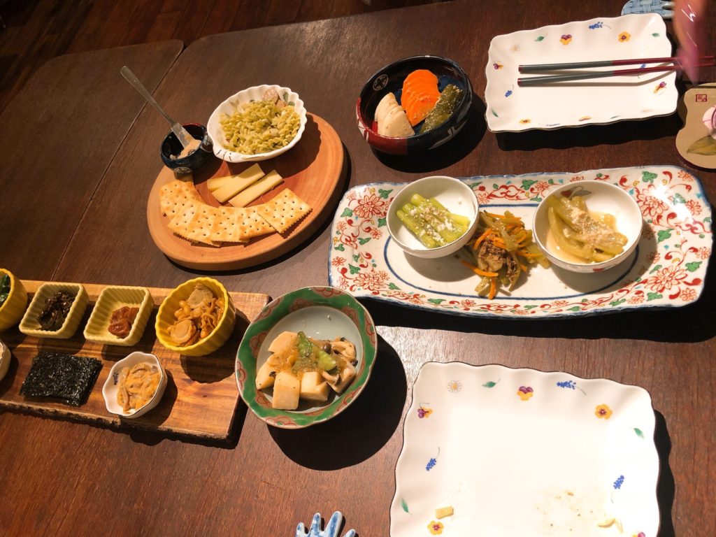 2枚爪のせいかネイルが剥がれてしまい、本日は爪屋さんは定休日ですがお直ししていただきました。併せて夜ゴハンも。前回からのお約束で本日はBRUNOのホットプレートでの夜ゴハンなのですが、前菜が…バジルのマカロニサラダやウドの3種盛りやぬか漬けベビーホタテなどなどてんこ盛り。