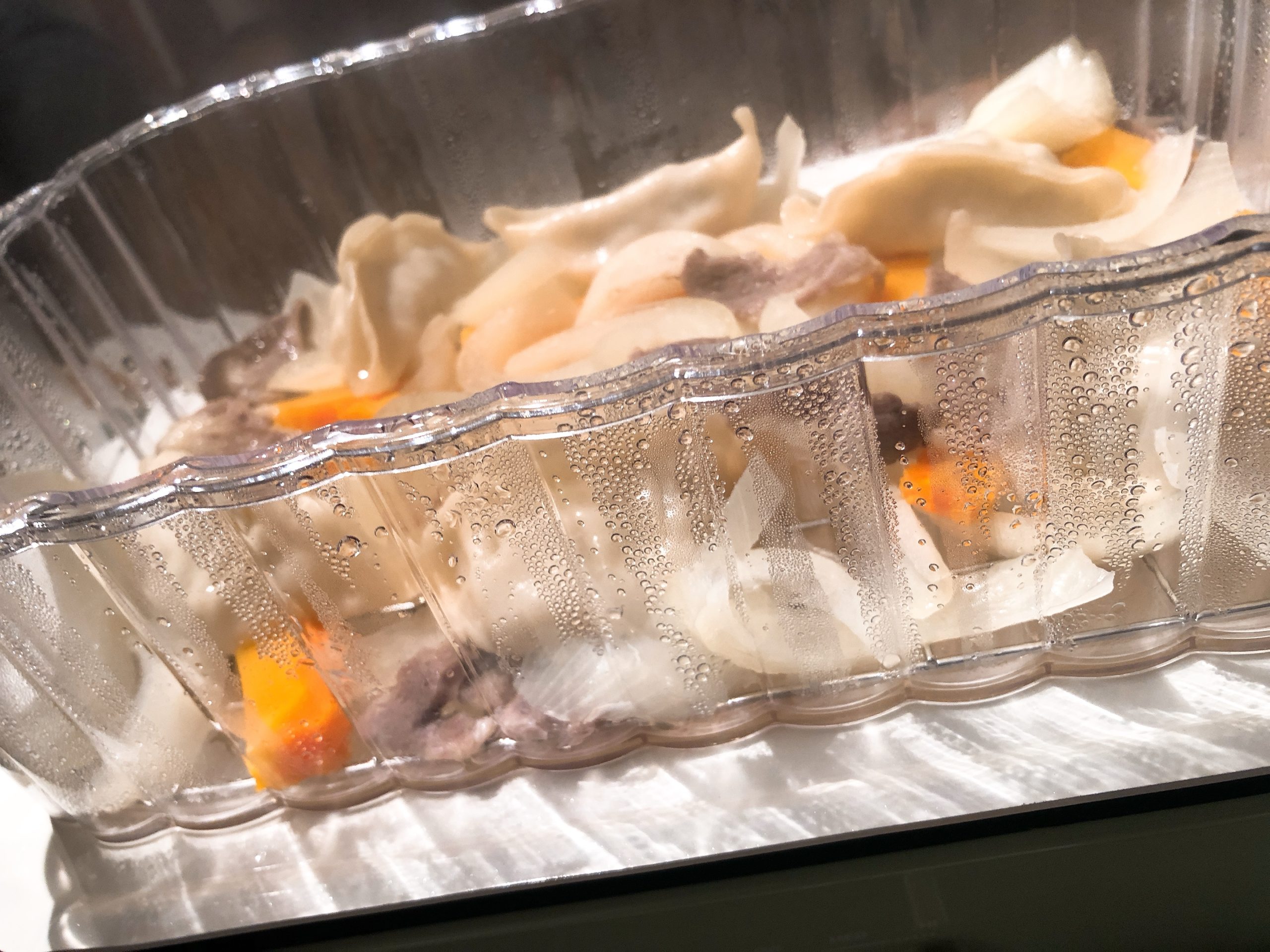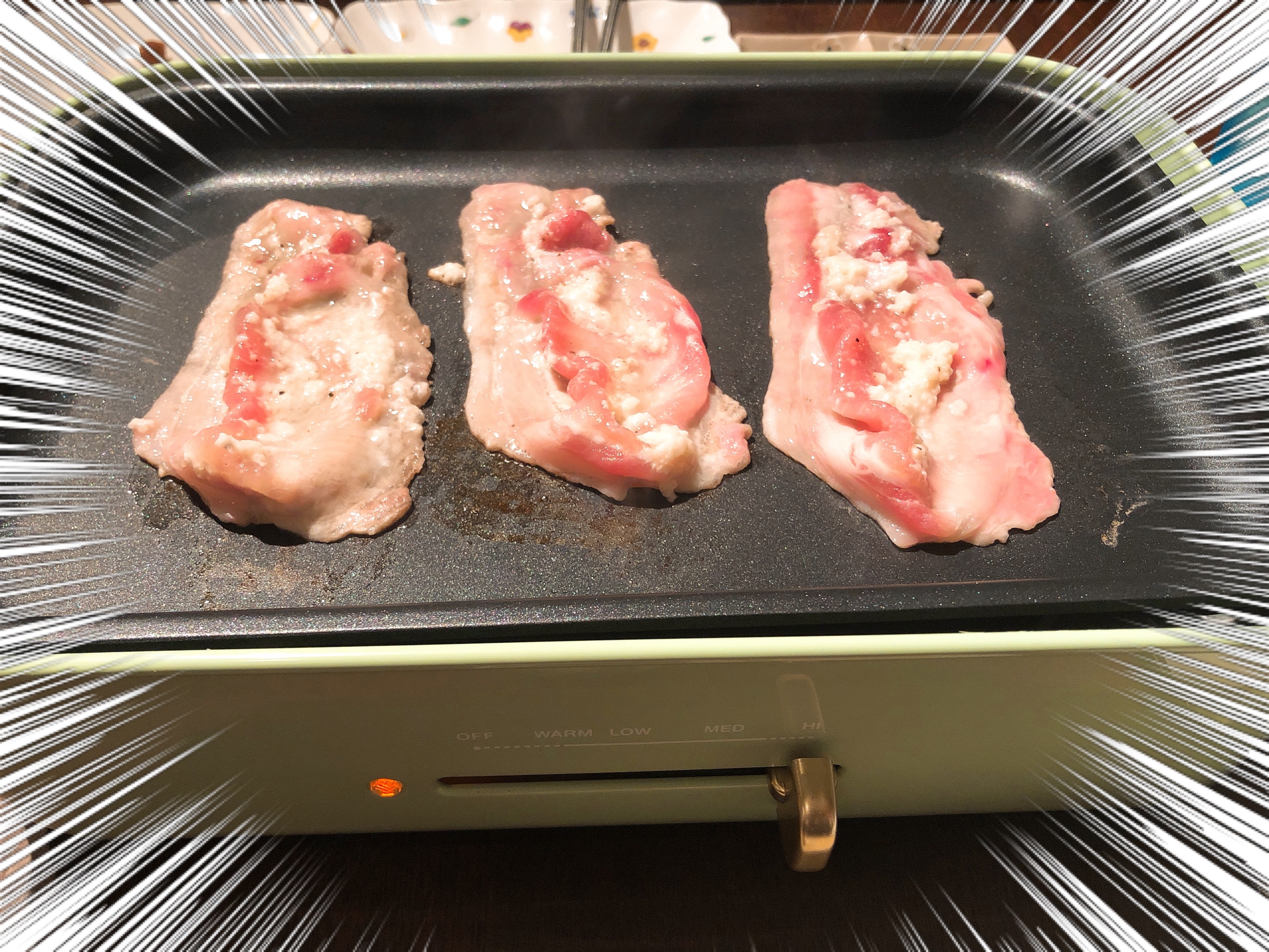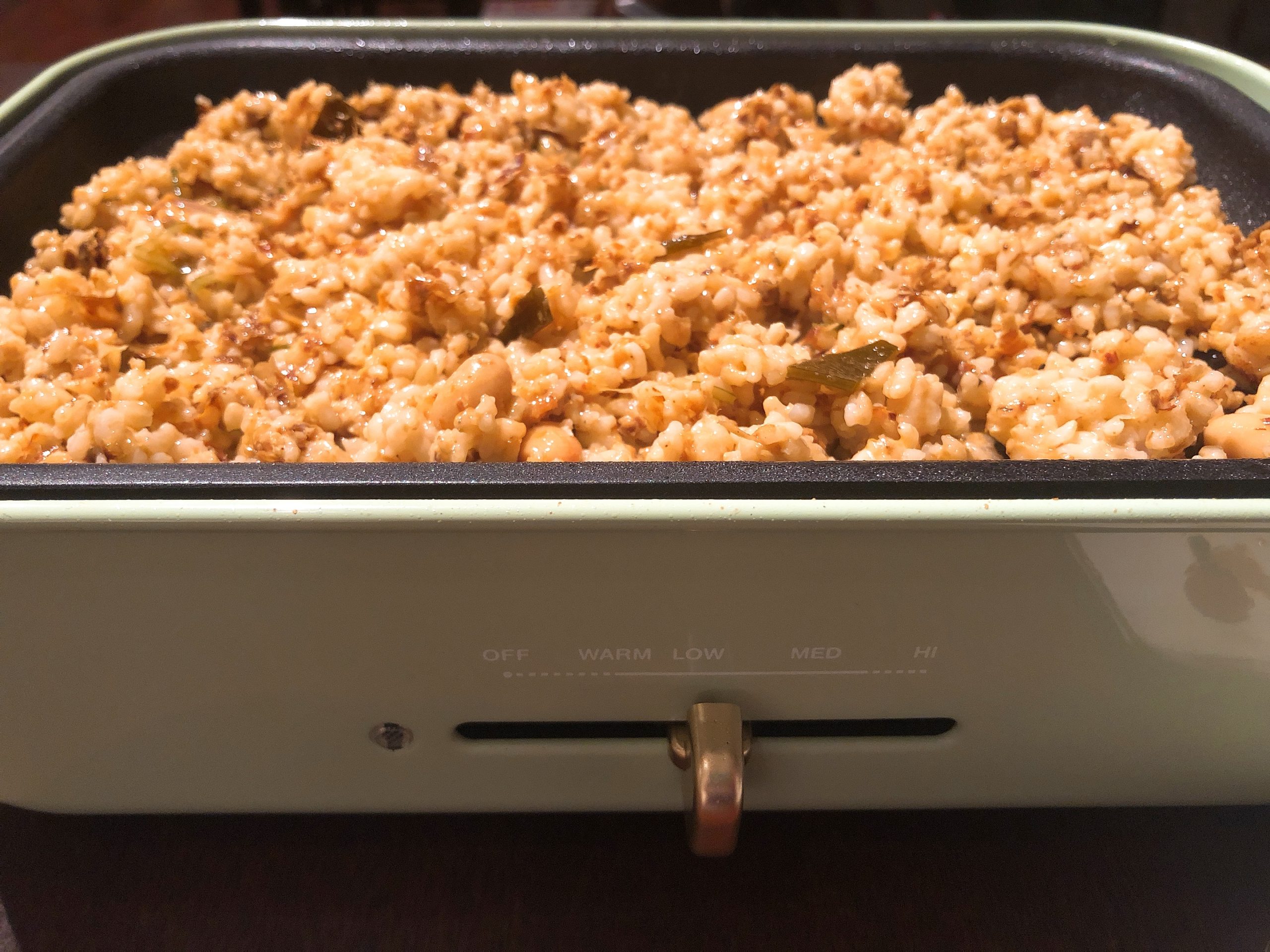 ホットプレート登場!まずは蒸しラム肉も野菜と餃子です。黒酢でも玉ねぎポン酢もどちらも野菜が甘くて美味しい。ラム肉も。餃子は水餃子より食べやすく、黒酢がぴったりでした。その後は、プレートに変え塩麹漬けの豚肉。豚肉はとても柔らかくて甘味がすごい!この塩麹美味しい。お土産にいただきました。シメは豚肉の油のプレートで焼き飯。お手製かつお節のふりかけ、玉子にごま油を混ぜ込んだ玄米ご飯の焼き飯。おこげも付き美味しかった。
