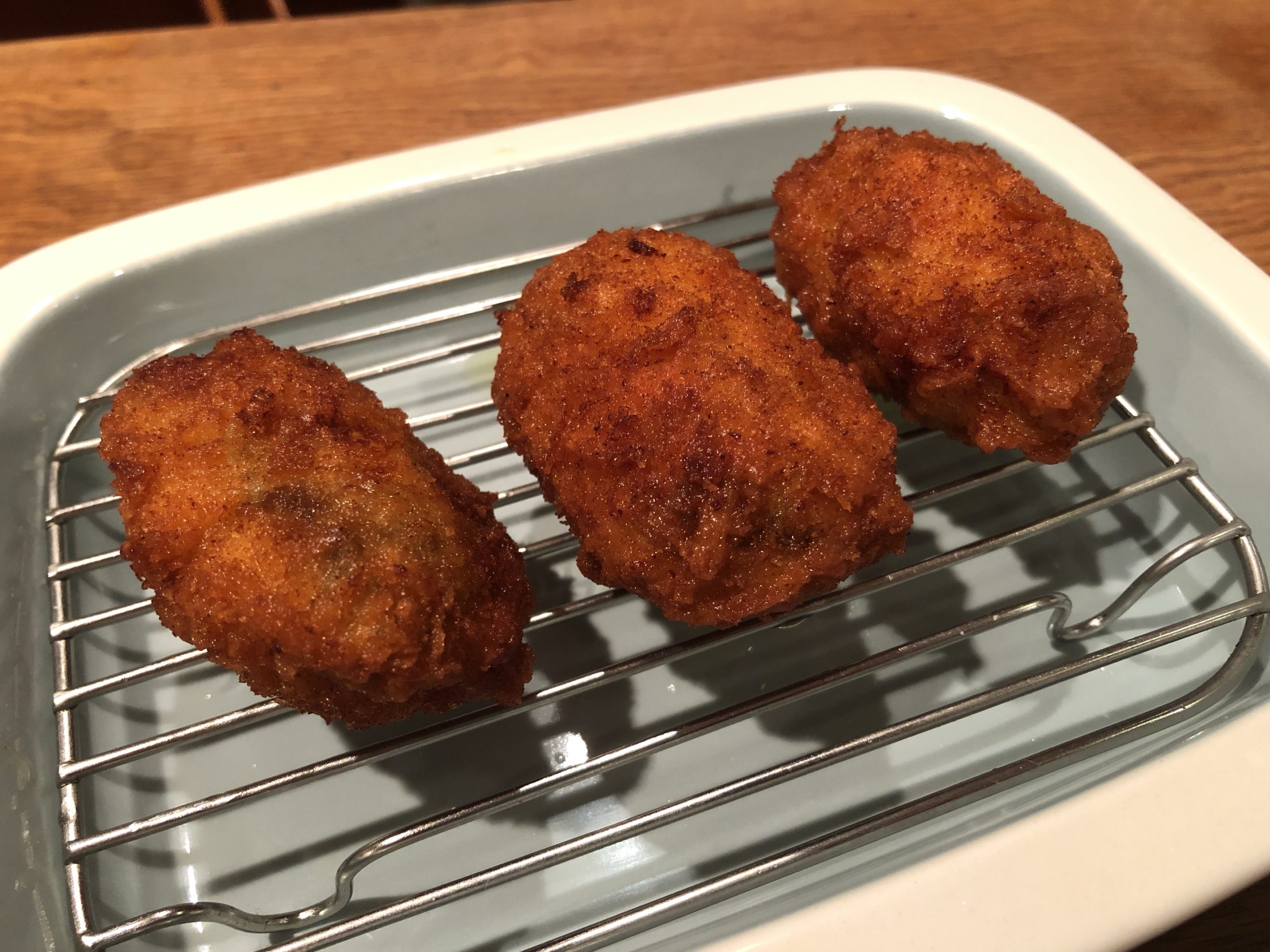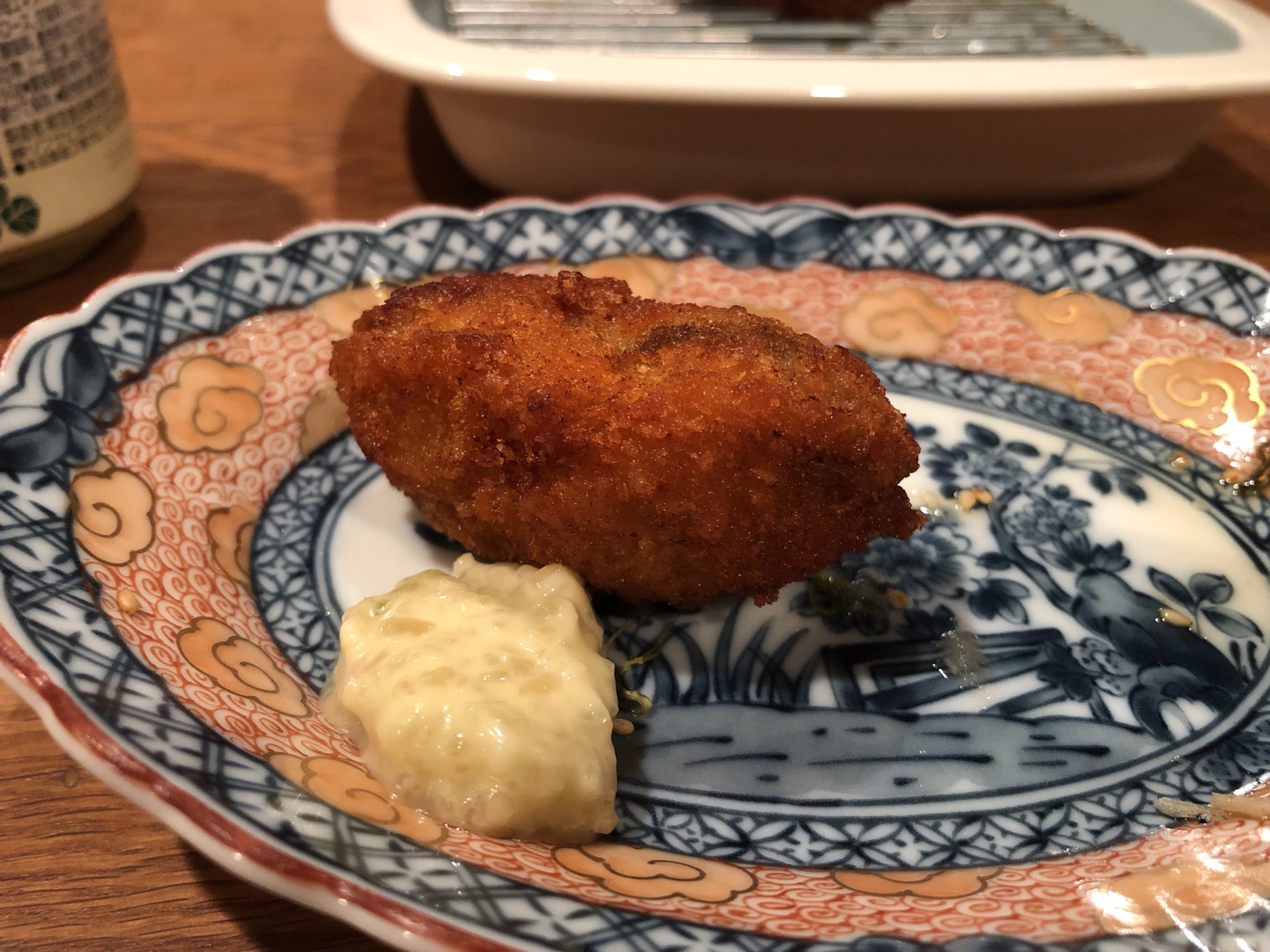 ここで久しぶりの揚げたて揚げ物。今日は牡蠣フライ。わさびのタルタルソースでいただきました。